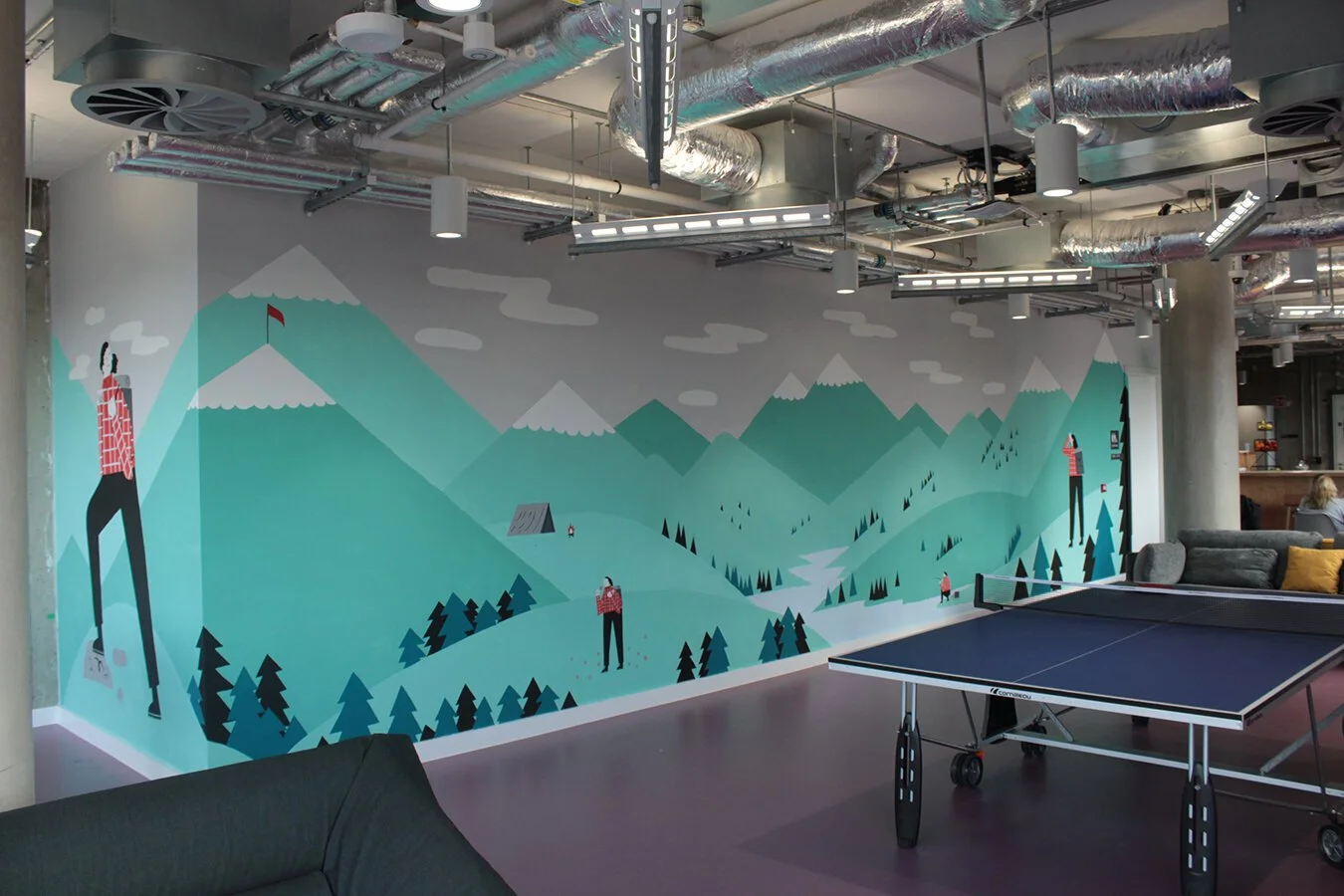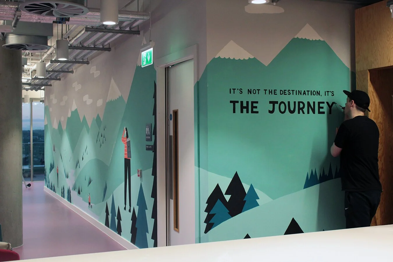 I’ve been making murals as long as I have been illustrating. Each mural is different and the process of completing it is informed by the surface, environment and constraints of the job at hand, resulting in a variety of different techniques used to get the best results. Take a look sure.